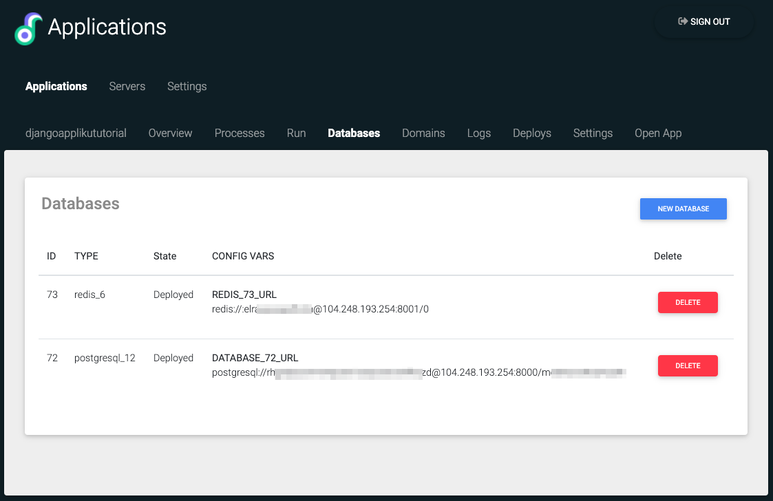 On the application overview page find the "Databases" block and click "Add Database".
